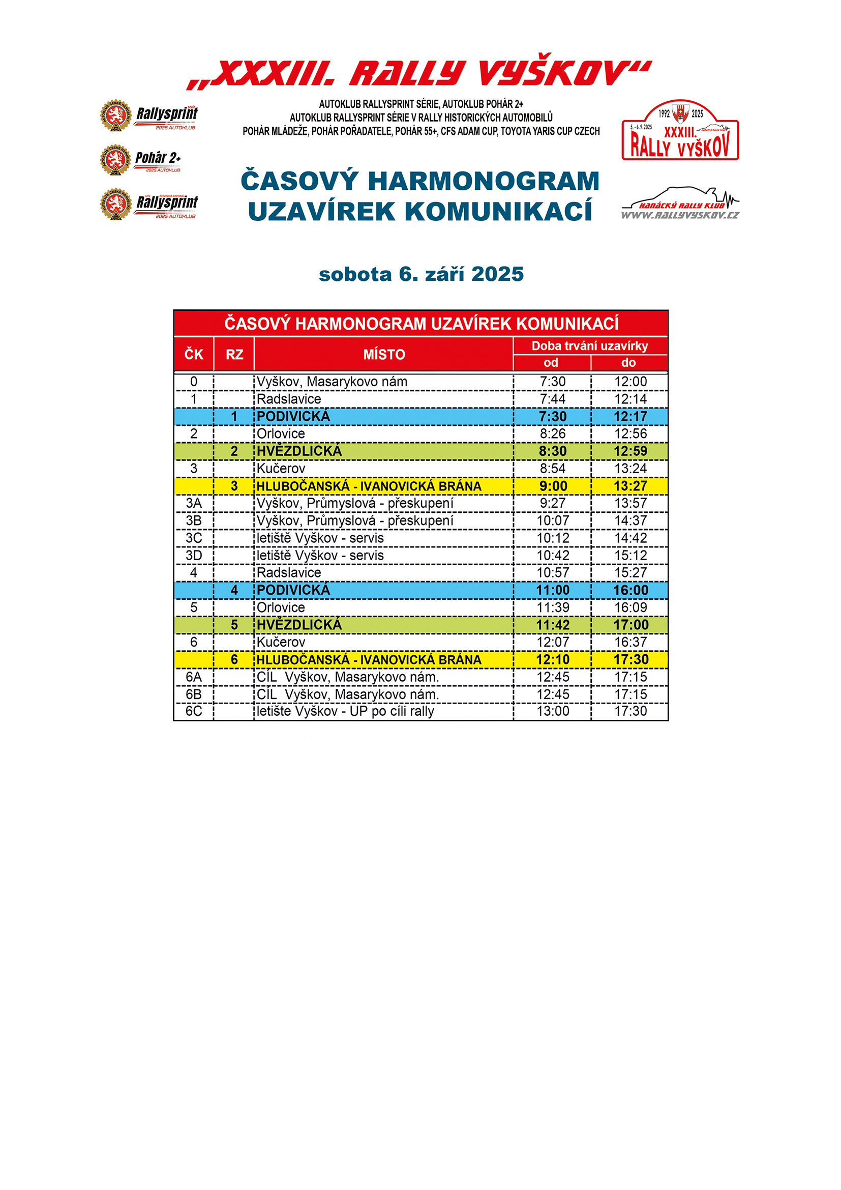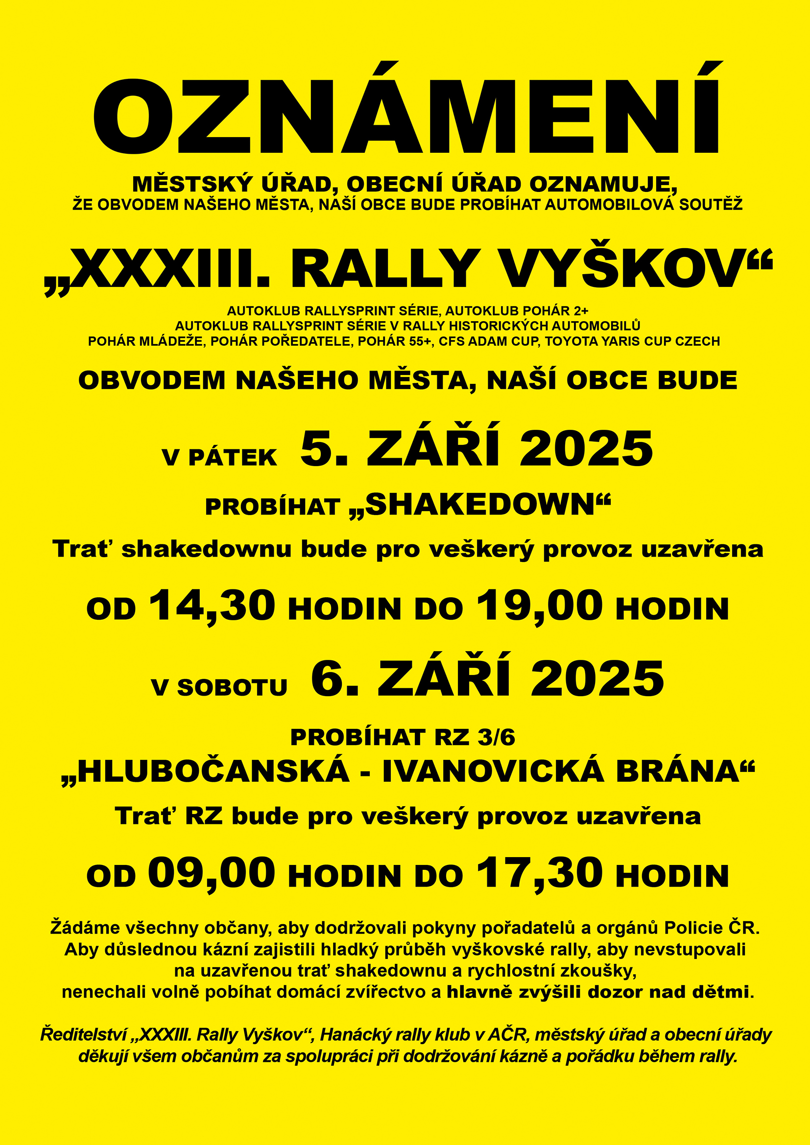 Oznámení "XXXIII. Rally Vyškov" 5.9. - 6.9.2025