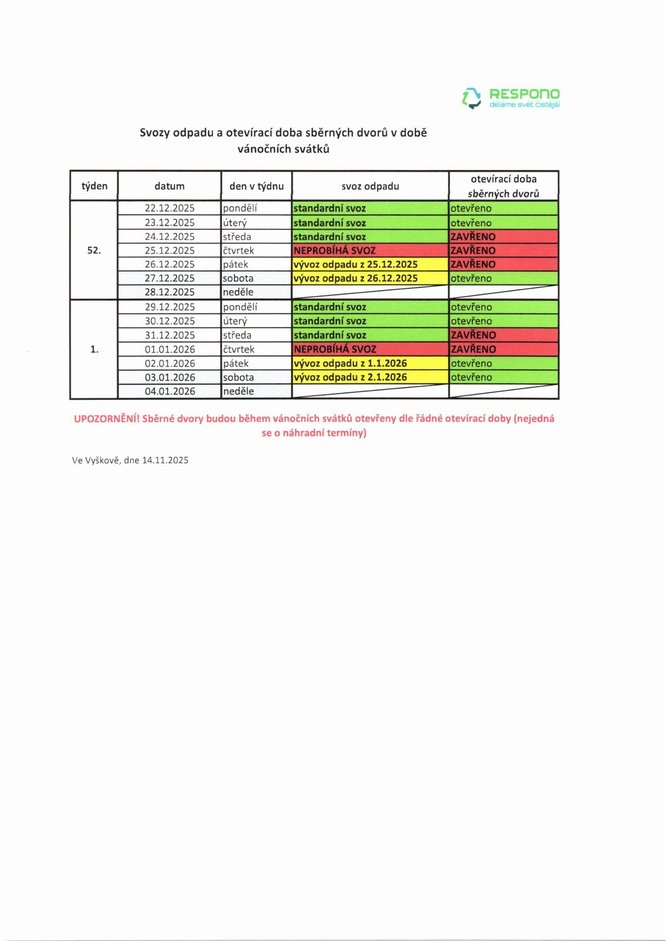 Svozy odpadu a otevírací doba sběrných dvorů v době vánočních svátků 2025