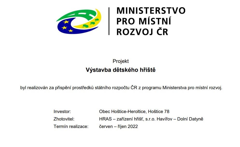 Projekt „Výstavba dětského hřiště“ v obci Hoštice-Heroltice byl realizován za přispění prostředků státního rozpočtu ČR z programu Ministerstva pro místní rozvoj – 11872 Podpora rozvoje regionů 2019+, z dotačního titulu: Podpora budování a obnovy aktivního a pasívního odpočinku.